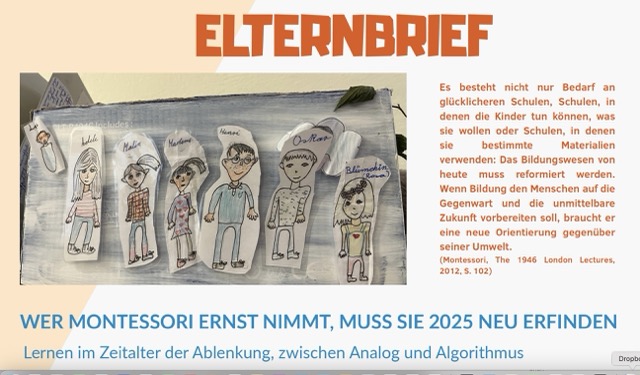 Diese Fähigkeiten entstehen nicht automatisch, sondern entwickeln sich nur dort, wo Schule und Elternhaus gemeinsam Bedingungen schaffen, auch für einen bewussten Umgang mit digitalen Reizen. Kinder, die zuhause unbegrenzt in Gerätewelten abtauchen, verlieren genau jene Konzentrationsfähigkeit, die sie in der Schule brauchen. Um es an dieser Stelle klar zu sagen, wer es wichtig findet, dass ein Kind schon im Grundschulalter oder gar im Kindergarten selbstverständlich mit digitalen Geräten aufwächst, sollte im verantwortungsvollen und Umgang mit der schulischen Entwicklung und damit mit der Zukunft seines Kindes keine Montessori-Schule wählen. Denn unser Gegenangebot, auch unser modernisiertes, wird dem nicht gewachsen sein.
